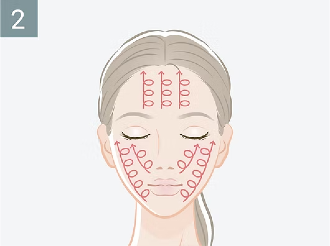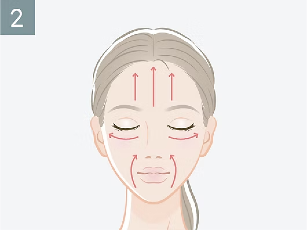 顎→類→額の順で動かし、眉間と眉は押えるように暫く止めて引き上げます。