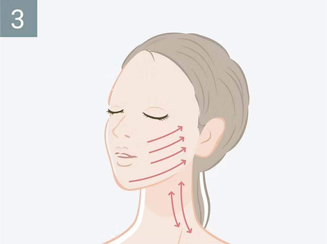 喉元を避け、首元もらせんを描くようにゆっくり動かします。タイマー終了後、ジェルをふき取るか洗い流します。